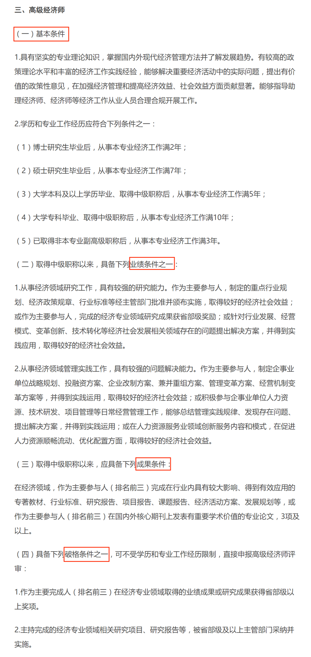 评定高级经济师除了具备基本条件外,还应当满足取得中级职称以来对应的业绩条件、成果条件等,对于具备破格条件的,可不受学历和专业工作经历限制,直接申报高级经济师评审。