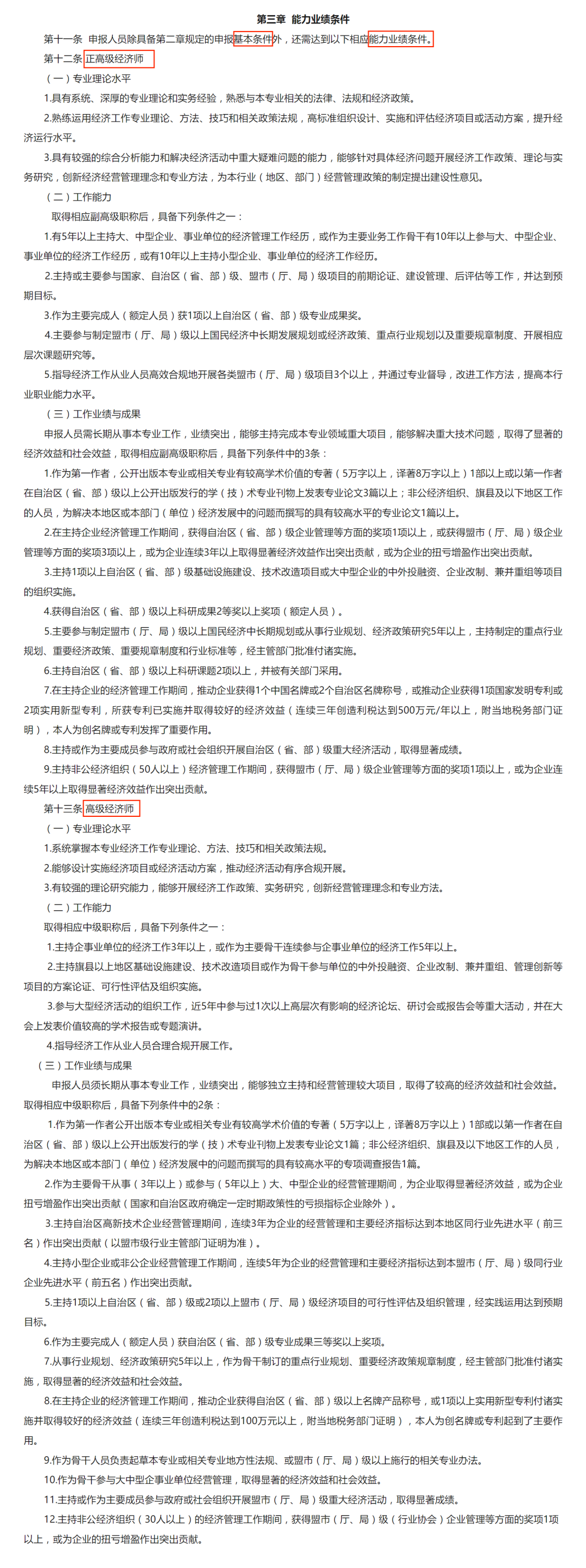 根据内蒙古自治区人力资源社会保障厅发布的关于印发《内蒙古自治区经济系列专业人员高级职称评审条件》的通知,申报正高级经济师或高级经济师除具备规定的申报基本条件外,还需达到通知要求的相应能力业绩条件。
