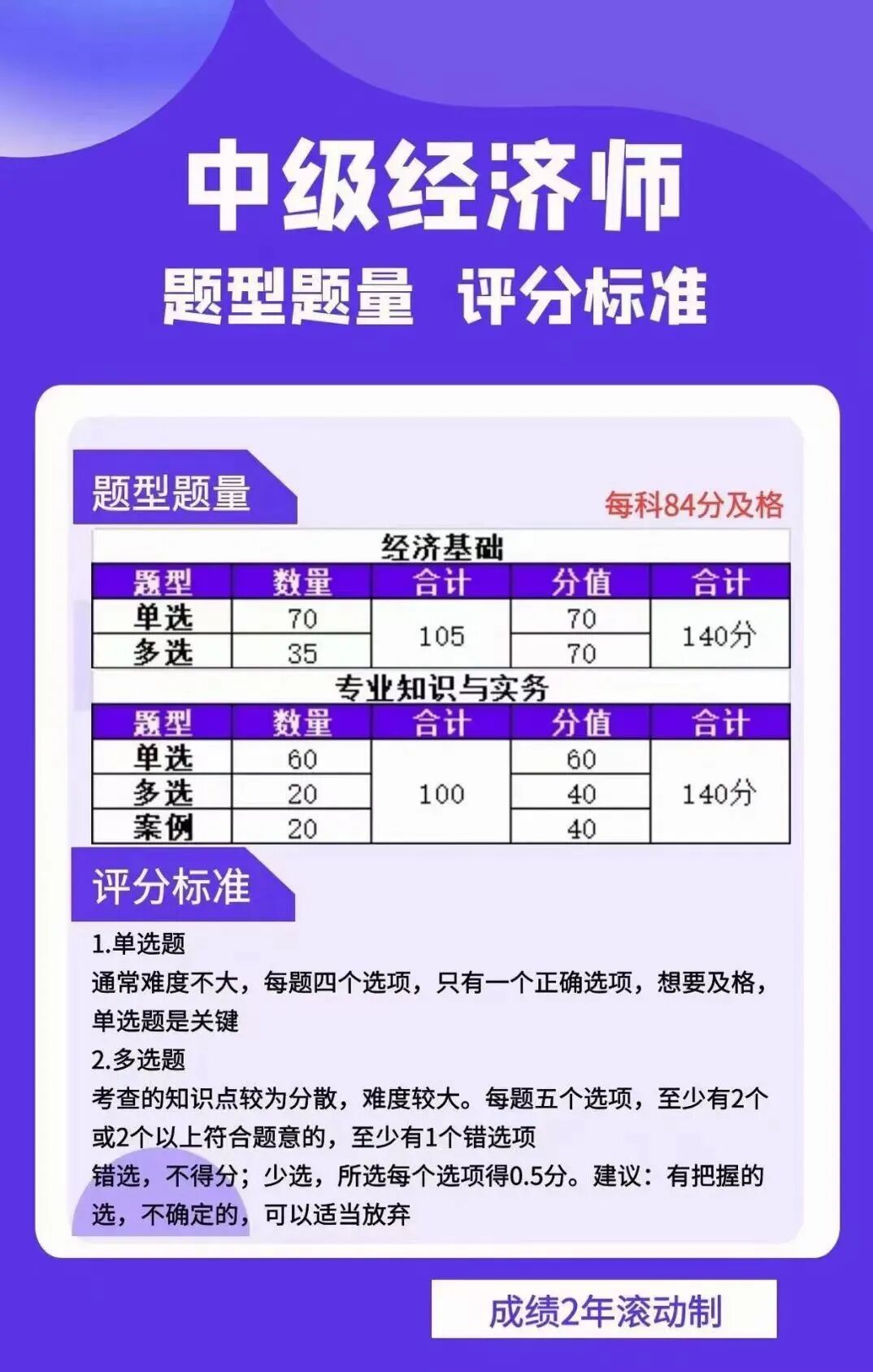考试形式:机考,时长:1.5小时一科,考试成绩实行2年滚动制(即连续两年内考过2科就可以),全国经济专业技术资格考试合格标准均为84分