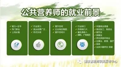 目前,我国的营养专业人才十分紧缺,公共营养师的就业前景非常广阔。公共营养师可以针对健康和亚健康人群做营养咨询、指导工作。公共营养师不仅可以在社区发挥重要作用,还可为企业员工、白领、高级管理人员、运动员、家庭提供教育、辅导、指导等服务。