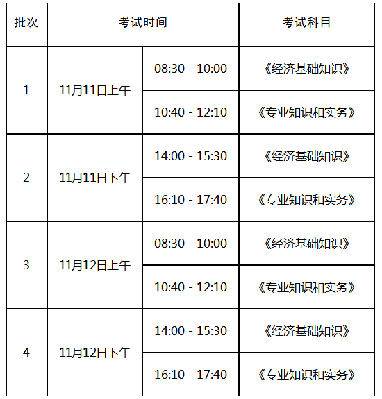 初中级经济考试设工商管理、农业经济、财政税收、金融、保险、运输经济、人力资源管理、旅游经济、建筑与房地产经济、知识产权等10个专业类别,每个专业均设公共科目《经济基础知识》和专业科目《专业知识和实务》,分2天,上、下午共4个批次实施。具体考试时间安排为: