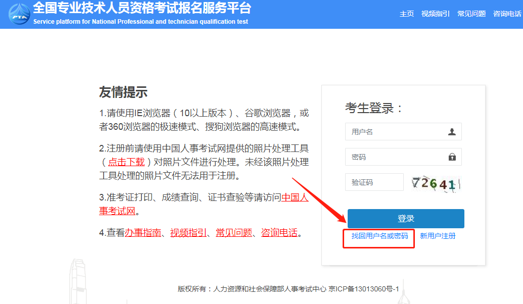 02 报名流程-注册阶段 账号注册(首次报考必读) 首次报考人员注册时,系统将对身份、学历学位信息进行在线核验,核验及注册完成后方可继续报名。 也就是说,在正式报名之前,考生需在中国人事考试网完成注册账号、完善个人信息并进行在线核验! 上传照片 注册完毕,使用注册的用户名、密码和验证码,再次登录报名系统,根据提示完成照片上传即可。 报名系统对照片有要求,考生在上传照片前,必须通过照片审核工具审核通过,审核通过的照片大小在10K左右。 找回账号或密码(非首次报考) 老考生可直接使用之前注册的用户名、密码、验证码进行登录报考操作! 如不小心遗忘了,可进入中国人事考试网首页,点击“网上报名”后,点击页面左侧“找回用户名或密码”,根据页面提示,通过预留问题/短信验证码找回。务必把用户名和密码妥善保存~ 如果以上方法均不能正常找回用户名或密码,一定要及时联系您报考当地的人事考试中心核实情况~