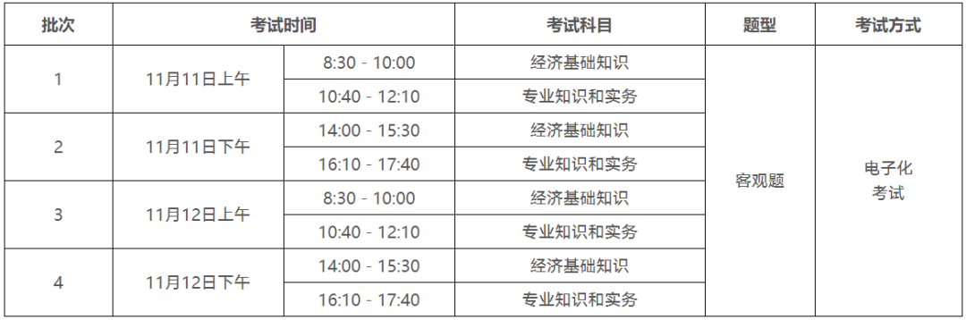 报名时间:8月14日9:00-8月24日17:00 缴费时间:8月14日9:00-8月25日17:00 准考证打印时间:11月7日9:00-11月10日17:00 考试时间:11月11日、12日 初级、中级经济专业技术资格考试(以下简称“初中级经济考试”)均设工商管理、农业经济、财政税收、金融、保险、运输经济、人力资源管理、旅游经济、建筑与房地产经济、知识产权等10个专业类别。 每个专业均设公共科目《经济基础知识》和专业科目《专业知识和实务》,分2天上、下午共4个批次实施。各批次考试安排如下: 注:各级别及专业类别的具体批次和考试时间以准考证为准。对于同时报考公共科目和专业科目的考生,两科目考试在同一批次内分2个场次连续组织,间隔时间为40分钟。 报考条件按照《人力资源社会保障部关于印发经济专业技术资格规定和经济专业技术资格考试实施办法的通知》(人社部规〔2020〕1号)有关规定执行。 凡遵守中华人民共和国宪法和法律,具有良好的道德品行和业务素质,符合初级、中级经济专业技术资格考试报名条件的经济专业人员,均可报名参加相应级别的考试。 (一)凡从事经济专业工作,具备国家教育部门认可的高中(含高中、中专、职高、技校,下同)以上学历,均可报名参加初级经济专业技术资格考试。 (二)具备下列条件之一者,可以报名参加中级经济专业技术资格考试: (三)知识产权专业人员于2020年前按照相关规定获得的知识产权领域初级职称,可作为报考知识产权专业中级经济考试的条件。 (四)取得导游资格、拍卖师、房地产经纪人协理、银行业专业人员初级职业资格,可对应初级经济专业技术资格;取得房地产估价师、咨询工程师(投资)、土地登记代理人、房地产经纪人、银行业专业人员中级职业资格,可对应中级经济专业技术资格;取得资产评估师、税务师职业资格等相关职业资格,可根据《经济专业人员职称评价基本标准条件》规定的学历、年限条件对应初级或中级经济专业技术资格,并可作为报名参加高一级经济专业技术资格考试的条件。 (五)以上报考条件中规定的专业工作年限的计算截止日期为2023年12月31日。 (六)根据原人事部《关于做好香港、澳门居民参加内地统一举行的专业技术人员资格考试有关问题的通知》(国人部发[2005]9号)和国务院台湾事务办公室国家发展和改革委员会关于印发《关于促进两岸经济文化交流合作的若干措施》的通知(国台发〔2018〕1号)精神,符合报考条件的香港、澳门和台湾居民,可以申请参加初中级经济考试。 (1)新注册的报考人员须详细阅读报名协议条款和注册须知,点击“接受”后填写用户信息,并上传电子照片;已注册的报考人员直接登录报名系统补充完善个人信息。 新注册的报考人员必须预先下载并使用报名系统指定的“照片处理工具”,上传经该工具审核处理并保存的本人近期彩色半身免冠白底正面证件电子照片后,方可在报名系统中通过照片审核。注册时上传的电子照片将用于准考证、考场座次表、证书、证书查询验证系统,请考生慎重选用。 (2)报名系统将对报考人员身份、学历学位等注册信息进行在线核查,完成相关数据核查后方可继续报名。 注册信息在线核查原则上需24小时,考生须在报名前预留充足时间、提前完成用户注册和学历学位信息补充,以免错过报名。 (3)“未通过”或“需现场核查”的报考人员在填报信息后,须按要求上传身份证、学历学位证书等。自2023年报名起,如报考人员提交的境内高等教育学历学位信息无法通过在线自动核验,应在报名前及时登录中国高等教育学生信息网(学信网)进行验证/认证,下载相关PDF格式在线验证/认证报告,报名期间按要求上传相关验证/认证报告,具体操作方式参见中国人事考试网考生问答栏目内容 (http://www.cpta.com.cn/question/1525.html)。如报考人员在考试报名截止前无法及时取得学历学位验证/认证报告,可临时上传PDF格式的学历学位电子文件继续完成报名。 考试成绩发布后10个工作日内,全科考试成绩达到合格标准且报名期间未上传验证/认证报告的人员,可登录广东人事考试网“广东省专业技术人员职业资格考试业务办理系统”的“报考资格在线核查”栏目按要求及时在线补交,接受人工核查。 1、2023年版初中级经济考试大纲已在中国人事考试网公布。 2、考生须携带准考证、有效期内的居民身份证(或社会保障卡)和准考证上允许的考试用具参加考试。 3、初中级经济考试各科目考试时长为1.5小时,每科目考试开始5分钟后一律禁止考生进入考场,考试结束前15分钟考生可提前交卷。 4、考生可登录中国人事考试网,利用模拟作答系统,提前熟悉考试作答界面和考试流程,掌握计算器等工具的使用。 5、为保障考试安全,维护考试公平公正,人事考试机构及其工作人员在考试过程中可以采取以下措施: ● 对考生进入或离开考场、考点,提出规范性要求; ● 查验考生身份证件、所携带物品,必要时可借助专门设备、专业人员进行检查; ● 依法收缴考试作弊设备,集中保管考生违规携带的工具、资料等物品; ● 对考试现场秩序和考试组织实施过程进行视频监控; ● 在必要范围内,协调通讯管理部门对无线通讯等进行干扰或屏蔽; ● 其他必要的安全管理措施。 6、考试过程中,考生须严格遵守机考系统列明的考场规则、操作指南和作答要求。如遇考试机故障、网络